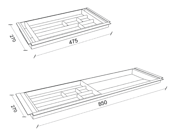 Sort metalpennebakke med udtræk, lås og plastbakke. Der medfølger to nøgler til låsen. Fås i to længder: 475 mm og 850 mm. Dimensioner: Kort: H 40 mm x L 475 mm x D 270 mm Lang: H 40 mm x L 850 mm x D 270 mm