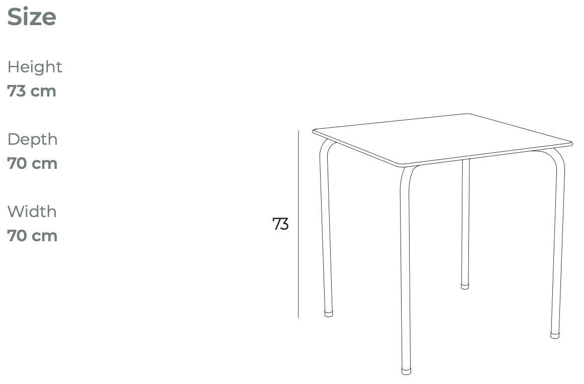 Stellet er af lakeret stål med bordplade i kompaktlaminat. Bordet er ekstrem holdbart samt let at rengøre og desinficere.