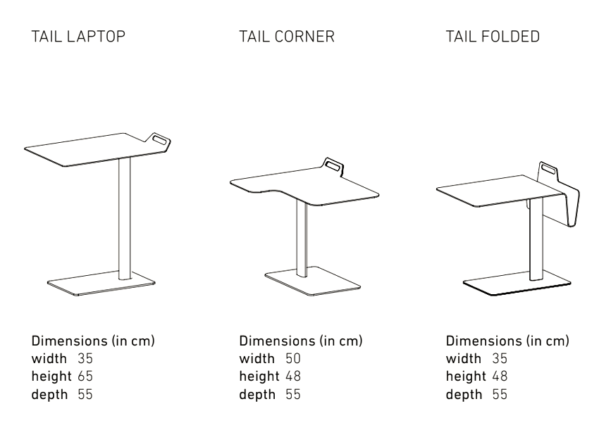Tail Table fås i 3 varianter: hjørne, foldet og et bærbar bord.