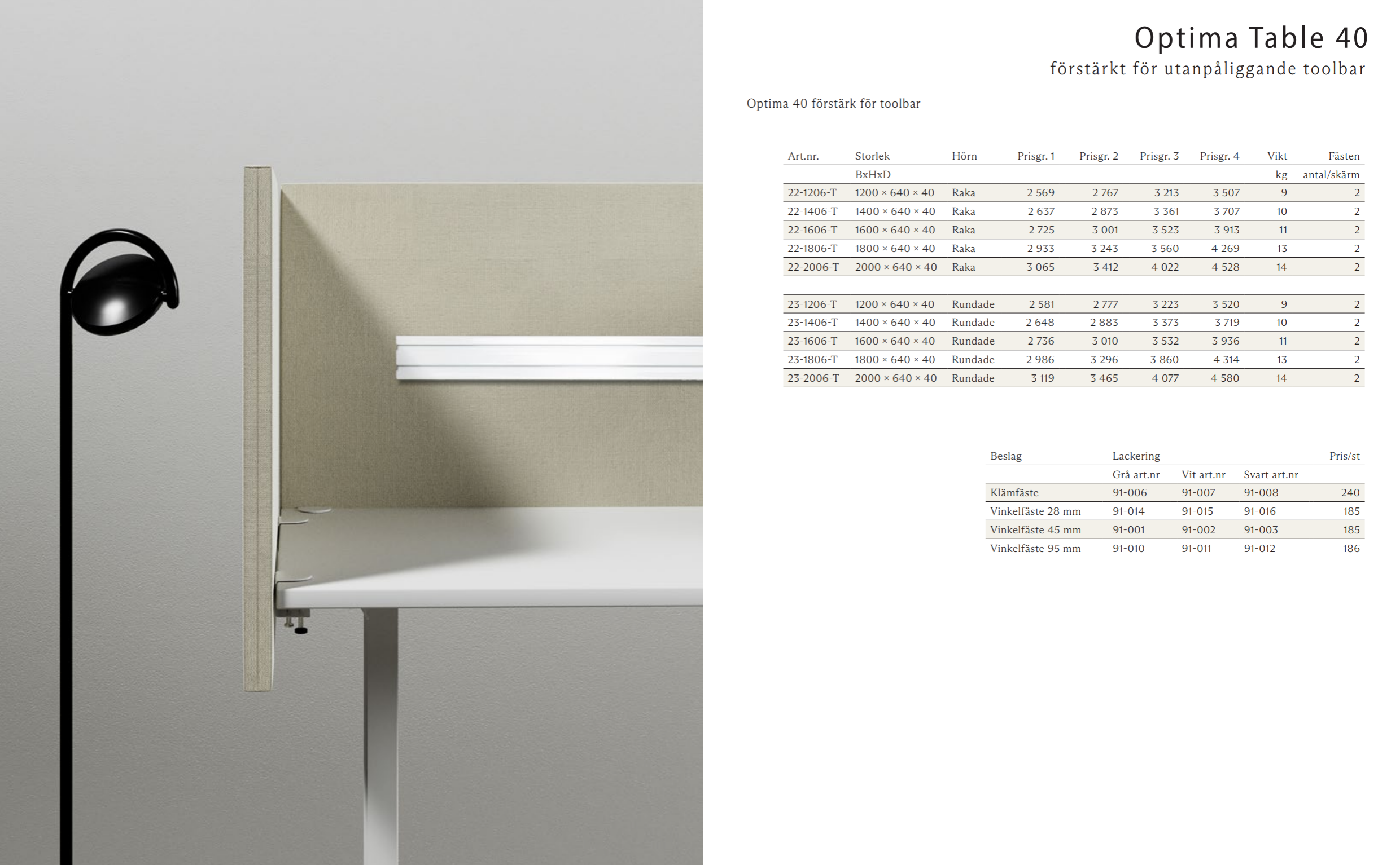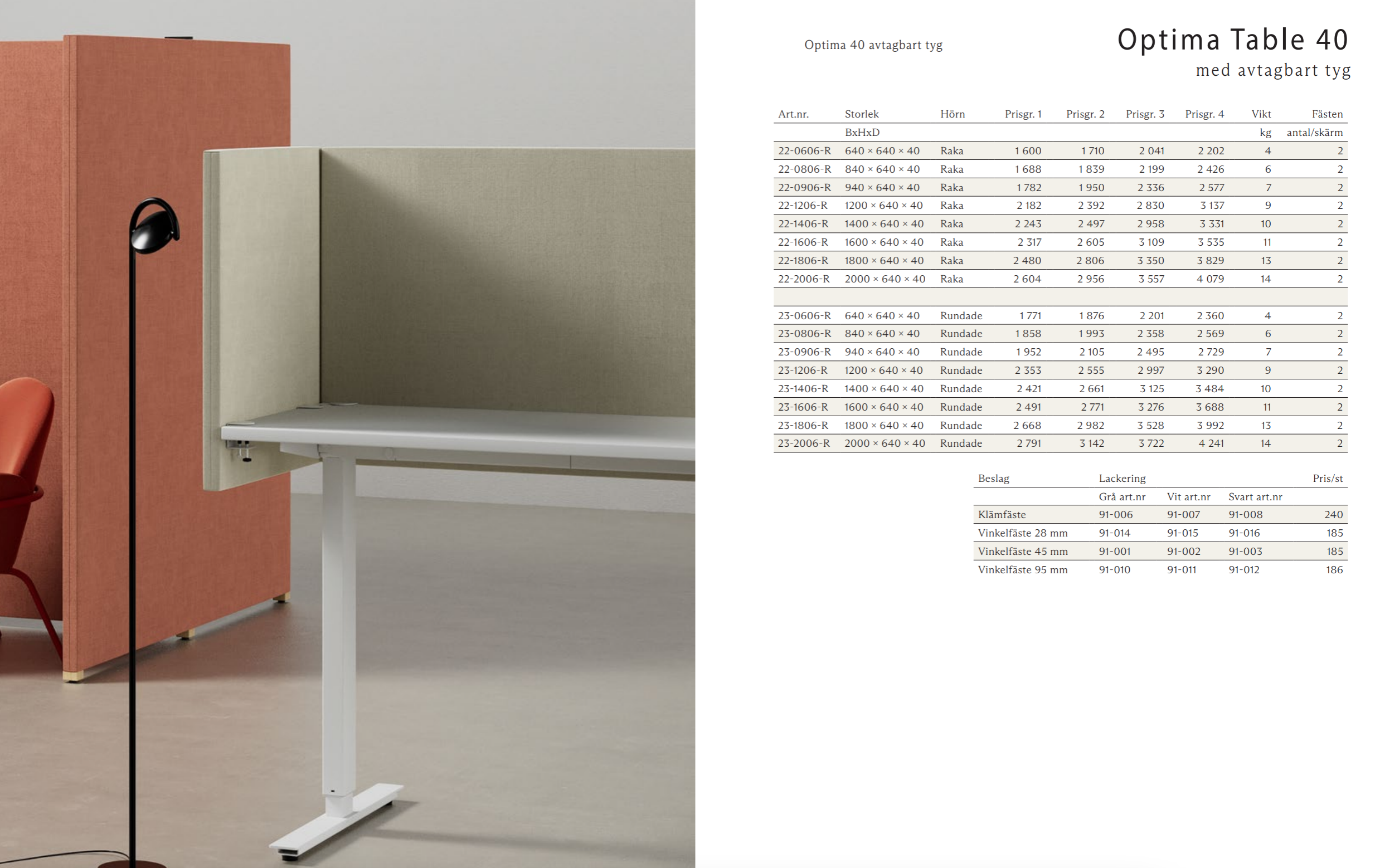 Priser for Optima bordskærm med aftageligt betræk - Priserne er i DKK ekskl. moms (gældende 2023)