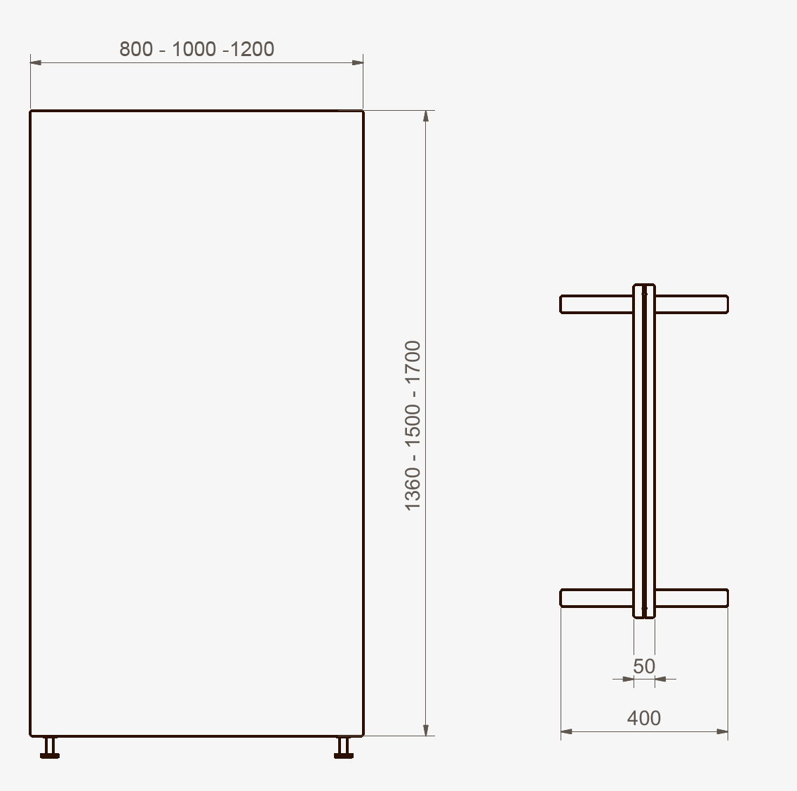 Skærmens tykkelse er 50 mm. Monteres helt uden værktøj. Monterede ben øger angiven skærmhøjde med 50 mm.