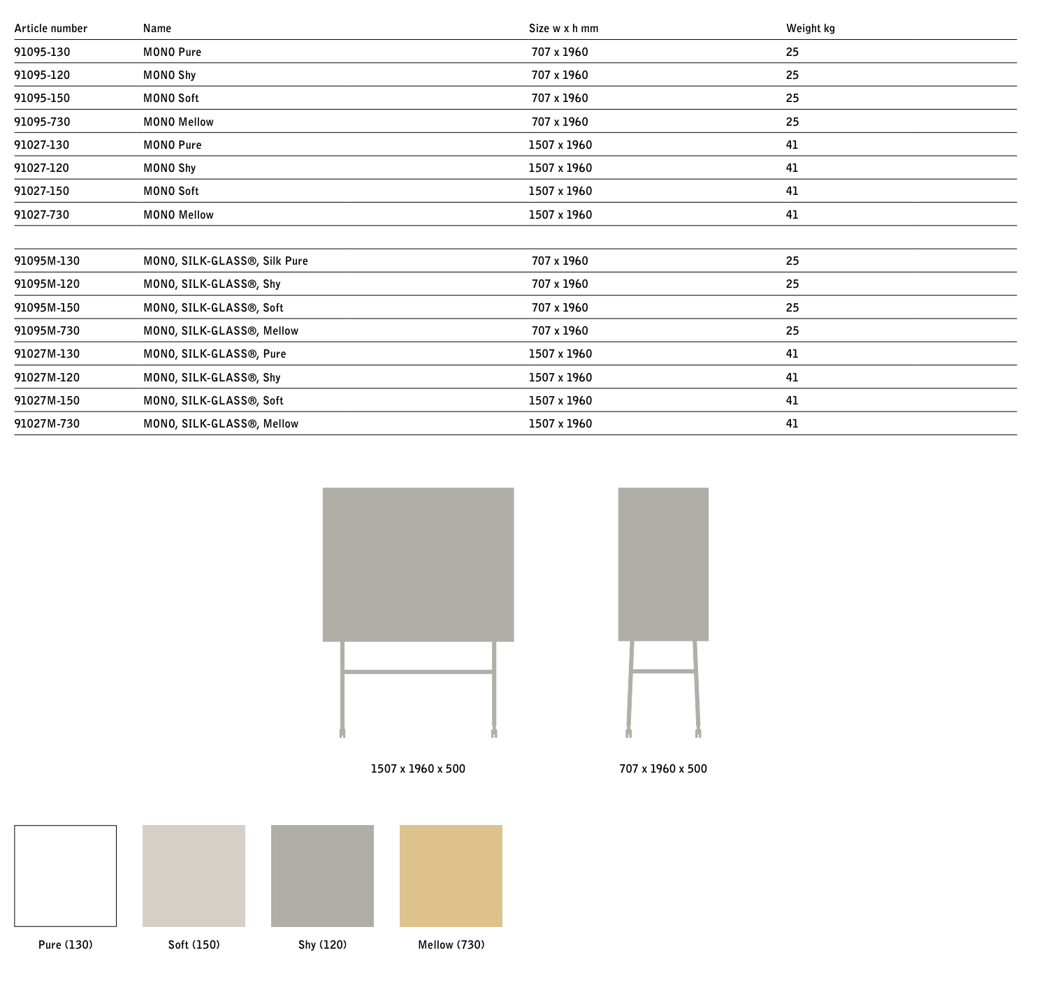 En mobil glastavle som kombinerer enkle rene linjer med en helt ensfarvet farve. Findes i hvid, to nuancer af grå og en blød gul farve. Mono fås med det klassiske Mood glas eller i mat SILK-GLASS®. Mono er et tidløst produkt til det moderne kontor. Designet af HALLEROED.