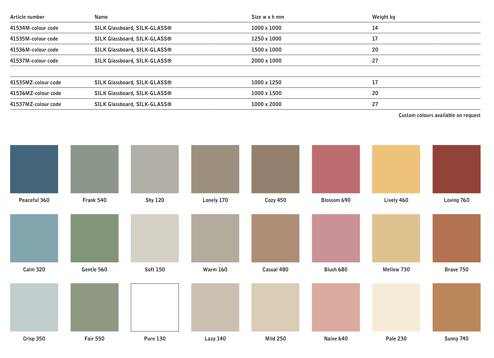 SILK-GLASS® er et enestående materiale med en glat, silkeagtig og mat overflade. Ingen refleksioner, men lige så god at skrive på og viske ud på, som enhver anden glastavle. Den unikke overflade giver vores 24 udvalgte farver en dybde og smukke farvenuancer, der fanger dagens skiftende lys. Dette gør Silk-glass til en revolutionerende mat overflade.