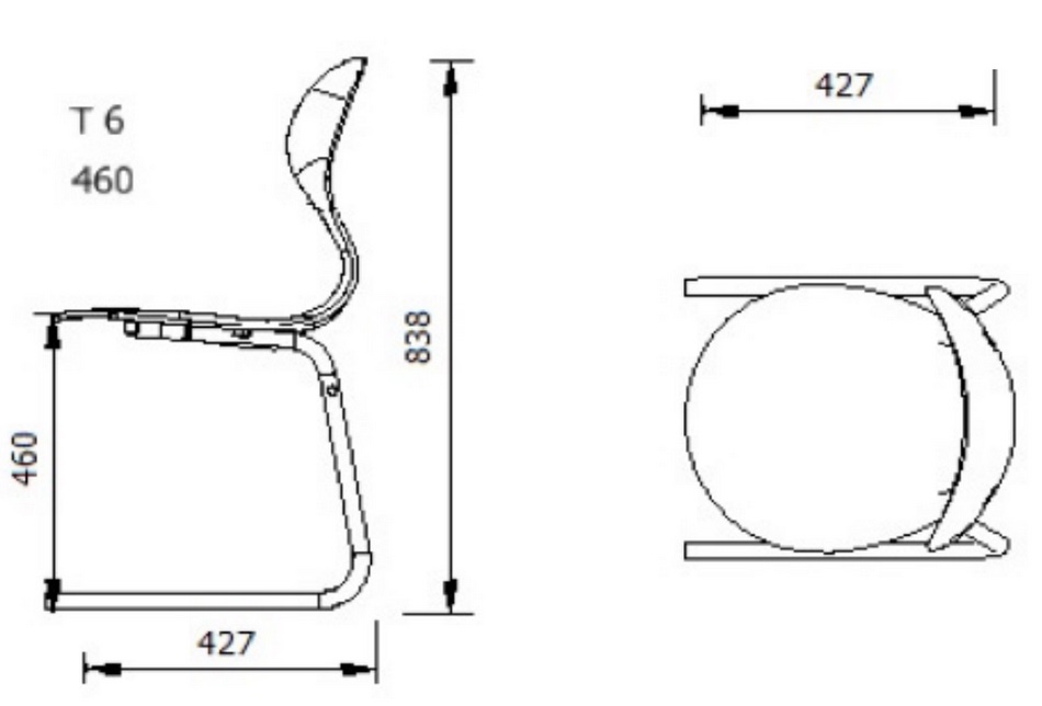 Ergonomisk sæde lavet af polypropylene. Benene er lavet af grå metal. Der er skridsikre gummiben og gummi til støtte på bordet.