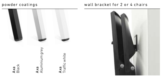 Integreret rille i ryglænet gør det muligt for klapstolen at hænge lige på et vægbeslag. Vægbeslag til 2 og 4 klapstole. Klapstolens mekanisme forhindrer stolen i at udfolde sig utilsigtet.