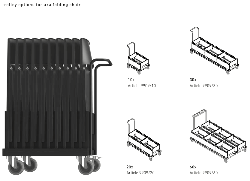 Klapstol trolley fås til 10, 20, 30 og 60 til håndtering af store volumener.