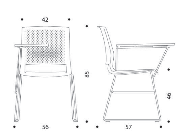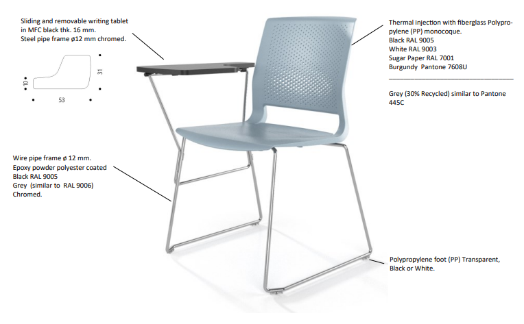 Sædet og ryglænet er i polypropylen med åndeligt hulmønster i ryglænet.