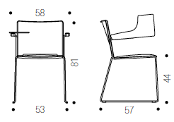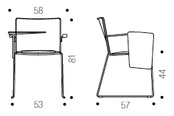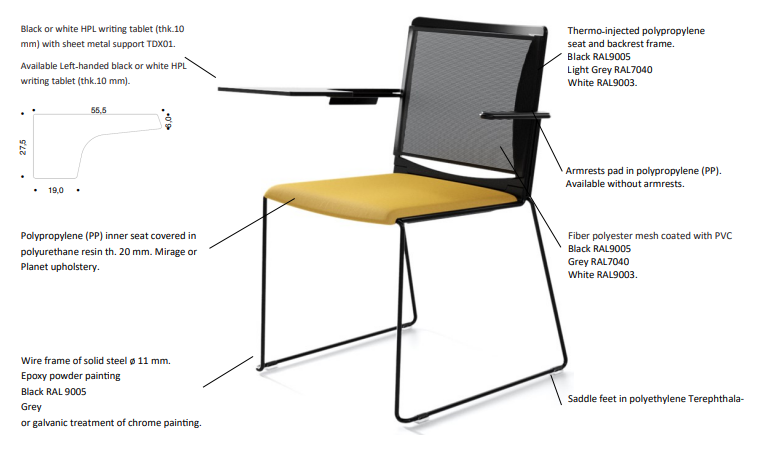 Sædet er i polypropylen med anti-UV-behandling og kan fåes med brandsikkert polstring.