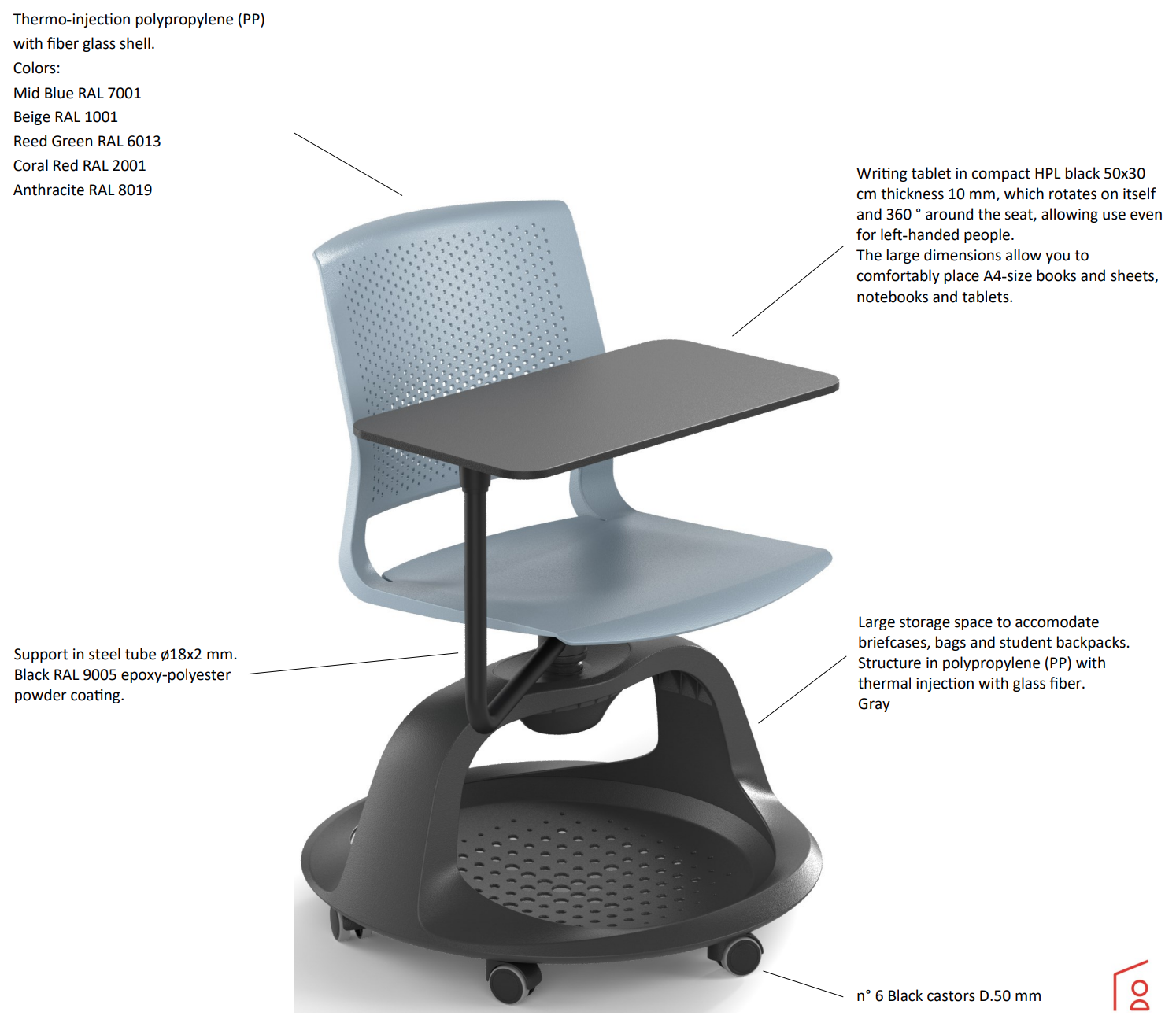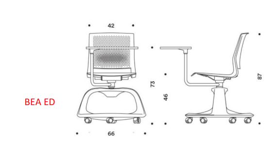 Bea elevstol versionen, er lavet for at imødekomme krav fra skoler og offentlige institutioner om et højkvalitetsstol. Dets genbrugsmateriale (CAM-GPP) er ergonomiske former opfylder dette behov og garanterer ekstrem komfort i lang tid, hvilket letter elever i at indgå i de daglige aktiviteter.