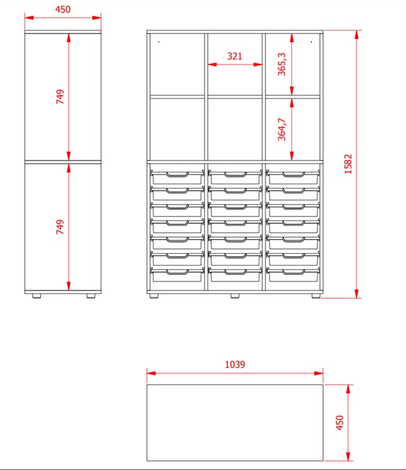 Skabet leveres med enten 21 lave kasser eller 12 høje kasser.